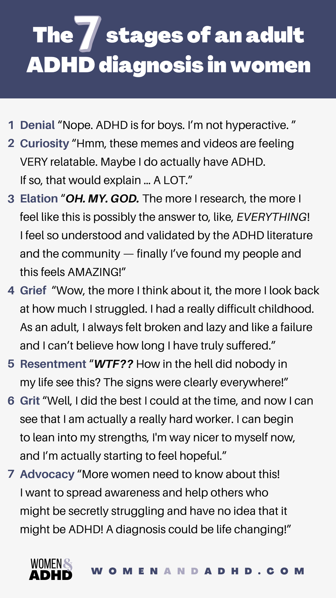 You've probably heard of the 7 Stages of Grief. Well, after my own experience with an adult diagnosis (and discussing it with so many women on the podcast), I've noticed there are commonalities with an adult ADHD diagnosis in women, too (whether it's an official diagnosis or a self-diagnosis). And, spoiler alert, one of them IS grief itself.